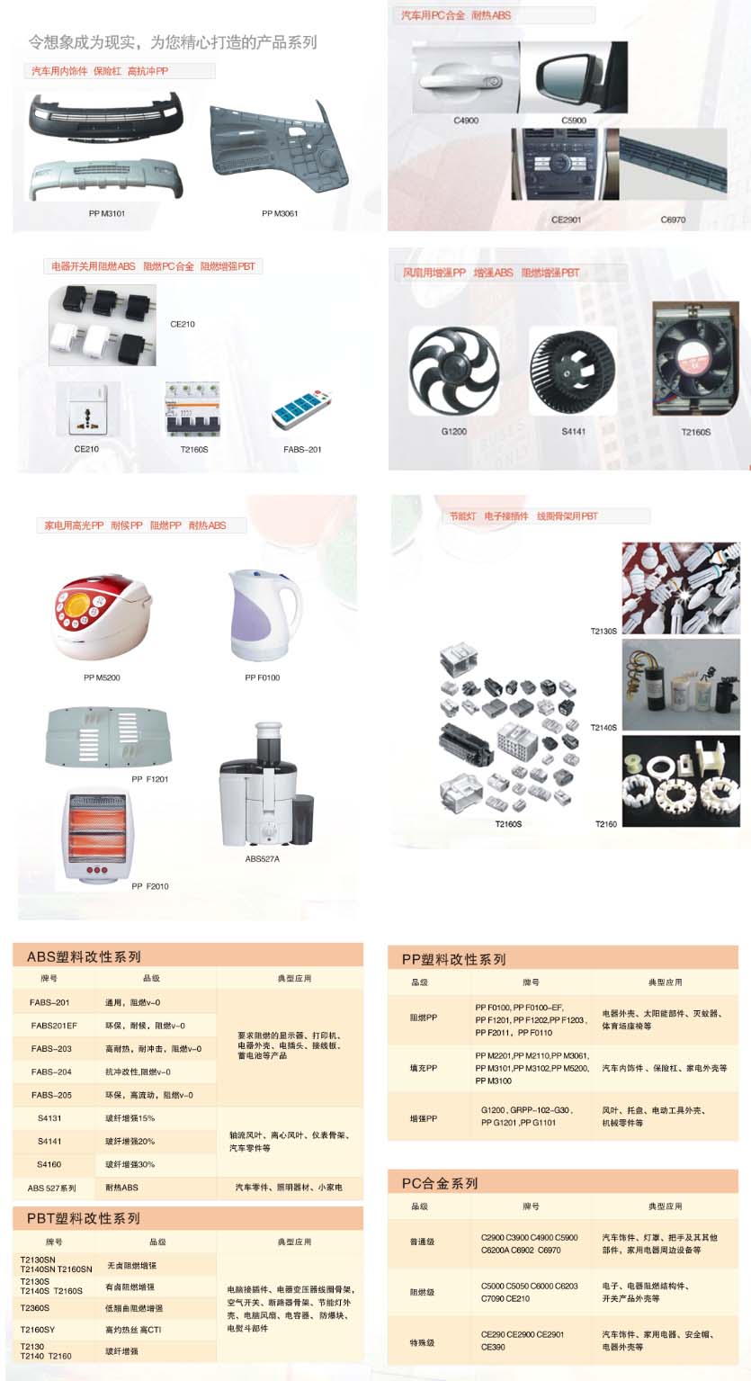 工程塑料广泛应用于汽车行业、电子电器行业、家电行业等各行业。精亮CHING LEUNG工程塑料中的PP阻燃、PP增强、高光PP、阻燃ABS、耐热ABS、PC/ABS合金、增强PA等不同改性材料给您更多的选择,使得您的想象成为现实。